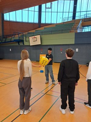 Am 10. Februar unterstützten mehrere Schülerinnen und Schüler der Einführungsphase den Jahrgang 6 der Sekundarschule am Eichholz bei der Durchführung des Body+Grips-Mobils des Deutschen Roten Kreuzes. Das Präventionsangebot bestand aus mehreren Stationen, an denen die Sechstklässler ihre Fitness testeten, sich mit gesunder Ernährung auseinandersetzten und sich über Sucht sowie deren Folgen informierten.