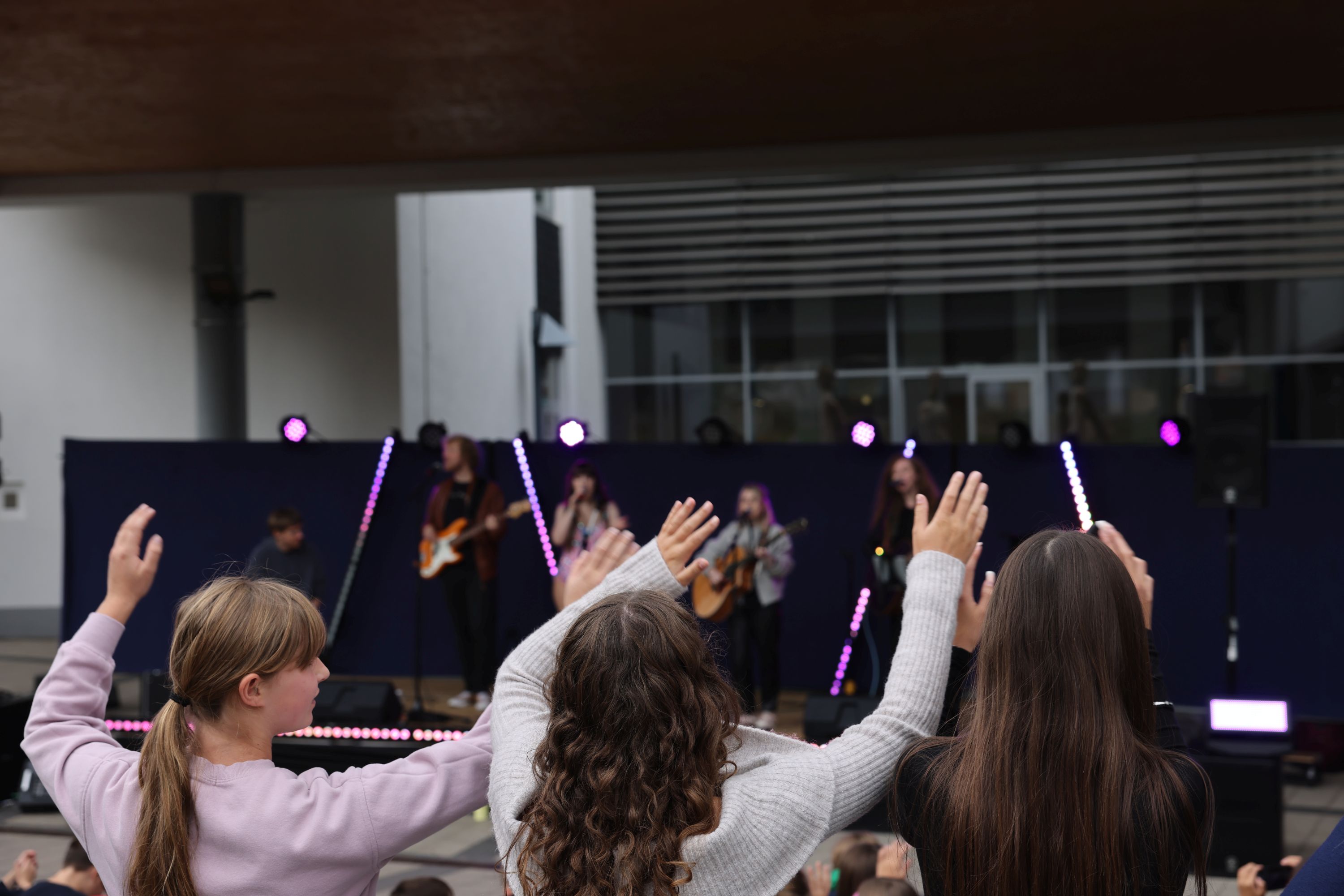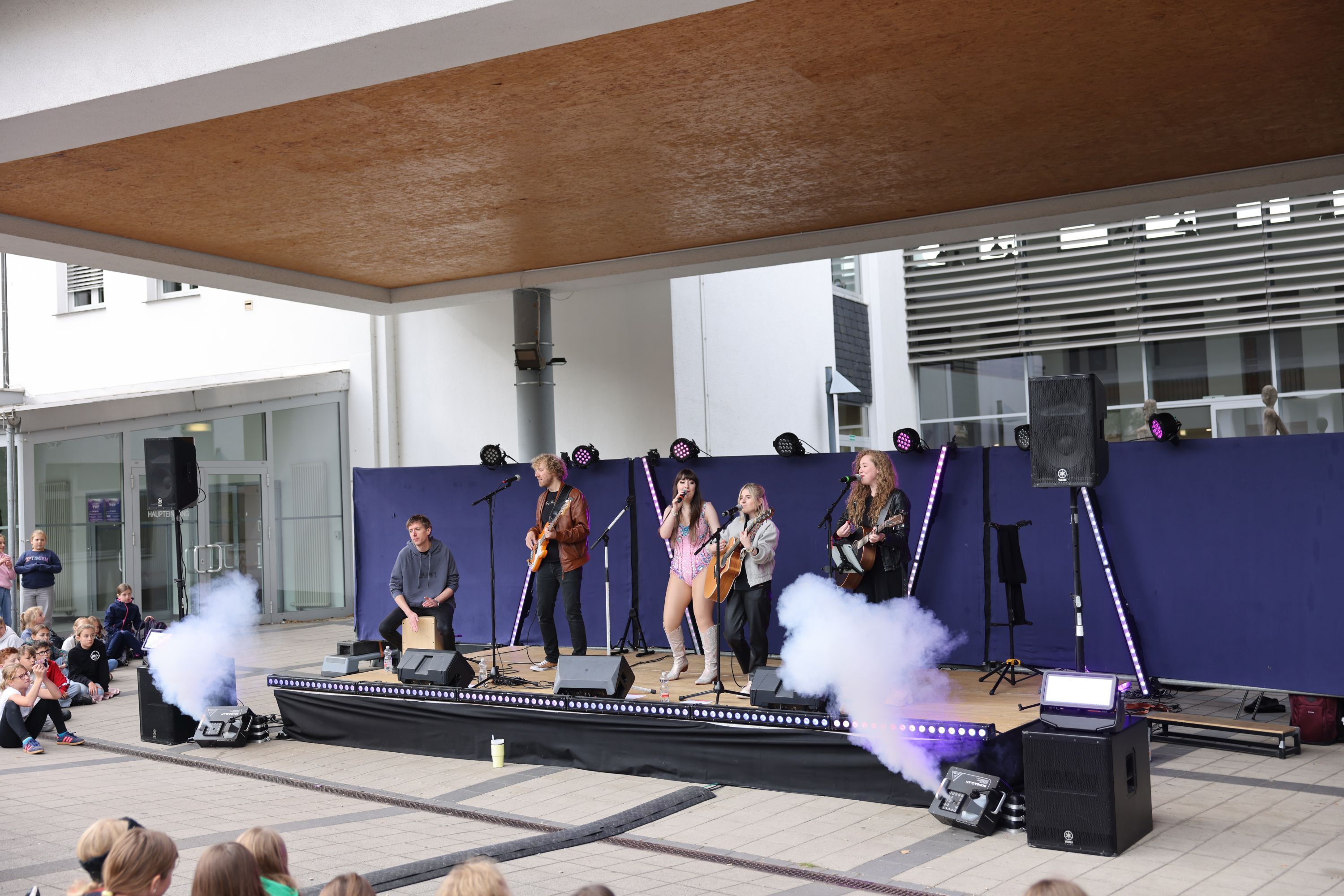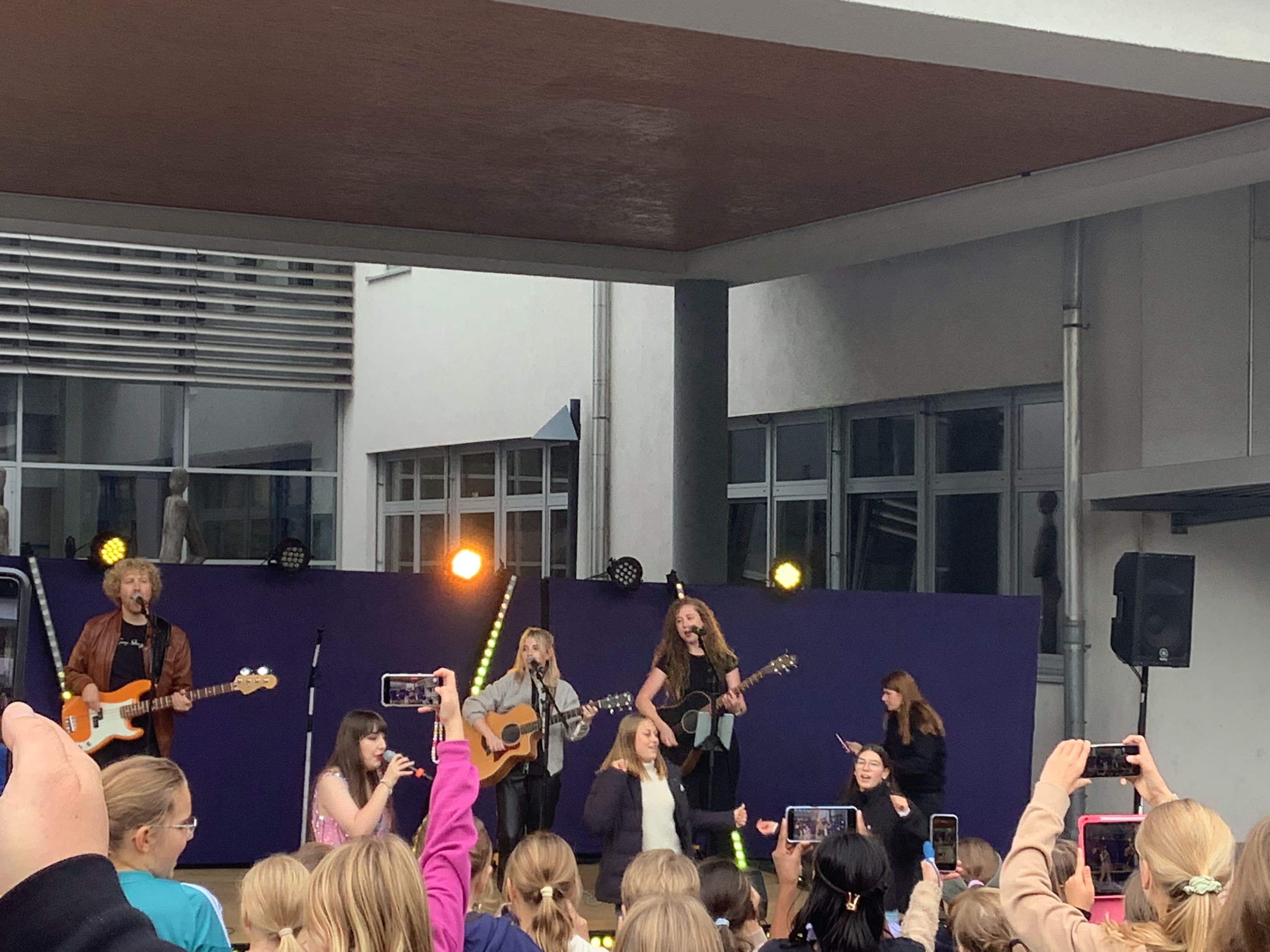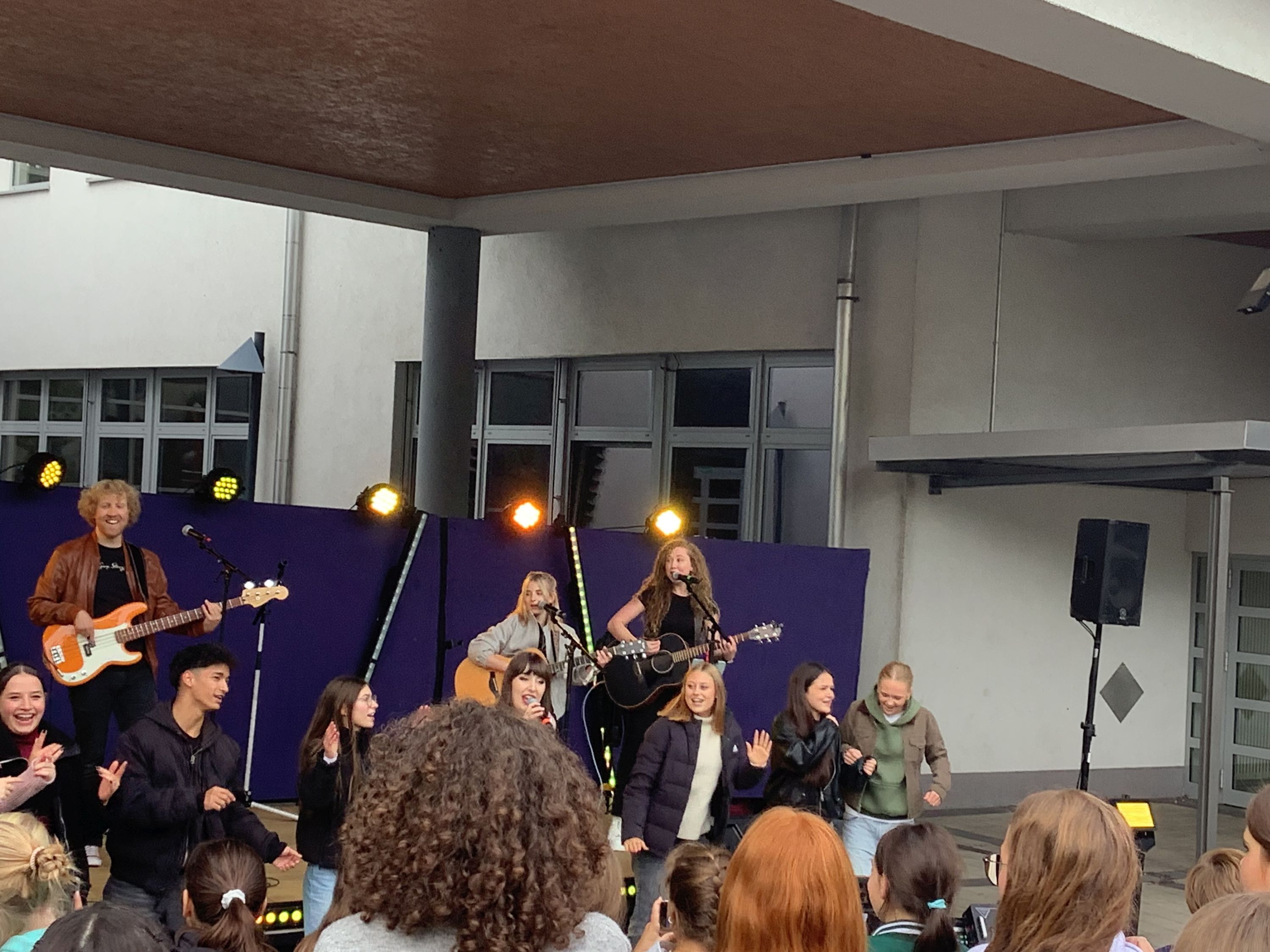 Die Songs luden sofort zum Mitsingen ein. Viele Schülerinnen und Schüler stimmten in die Refrains ein, wodurch ein gemeinschaftlicher Klang entstand, dem sich auch Lehrkräfte anschlossen. Das Konzert bleibt damit als fröhlicher und gemeinschaftsstiftender Moment im Gedächtnis.