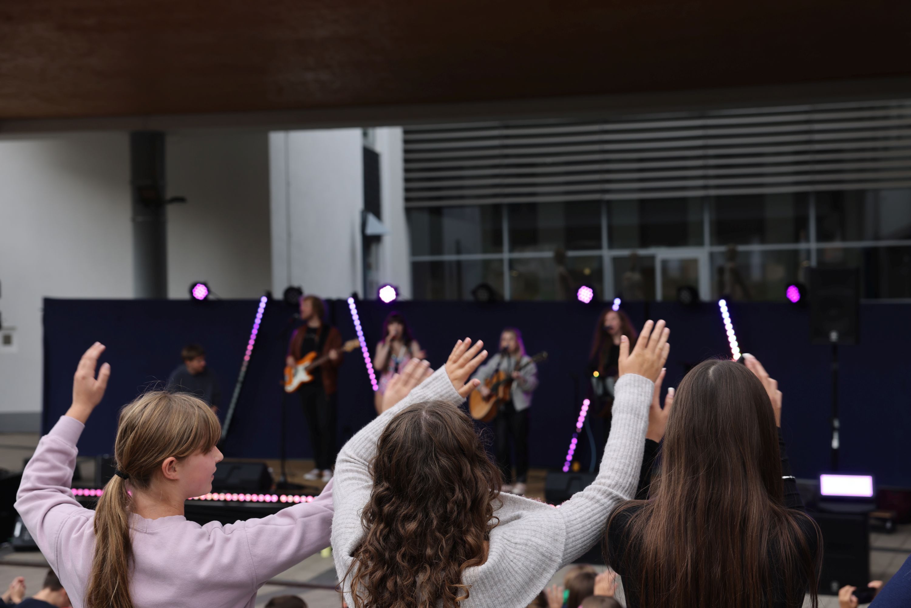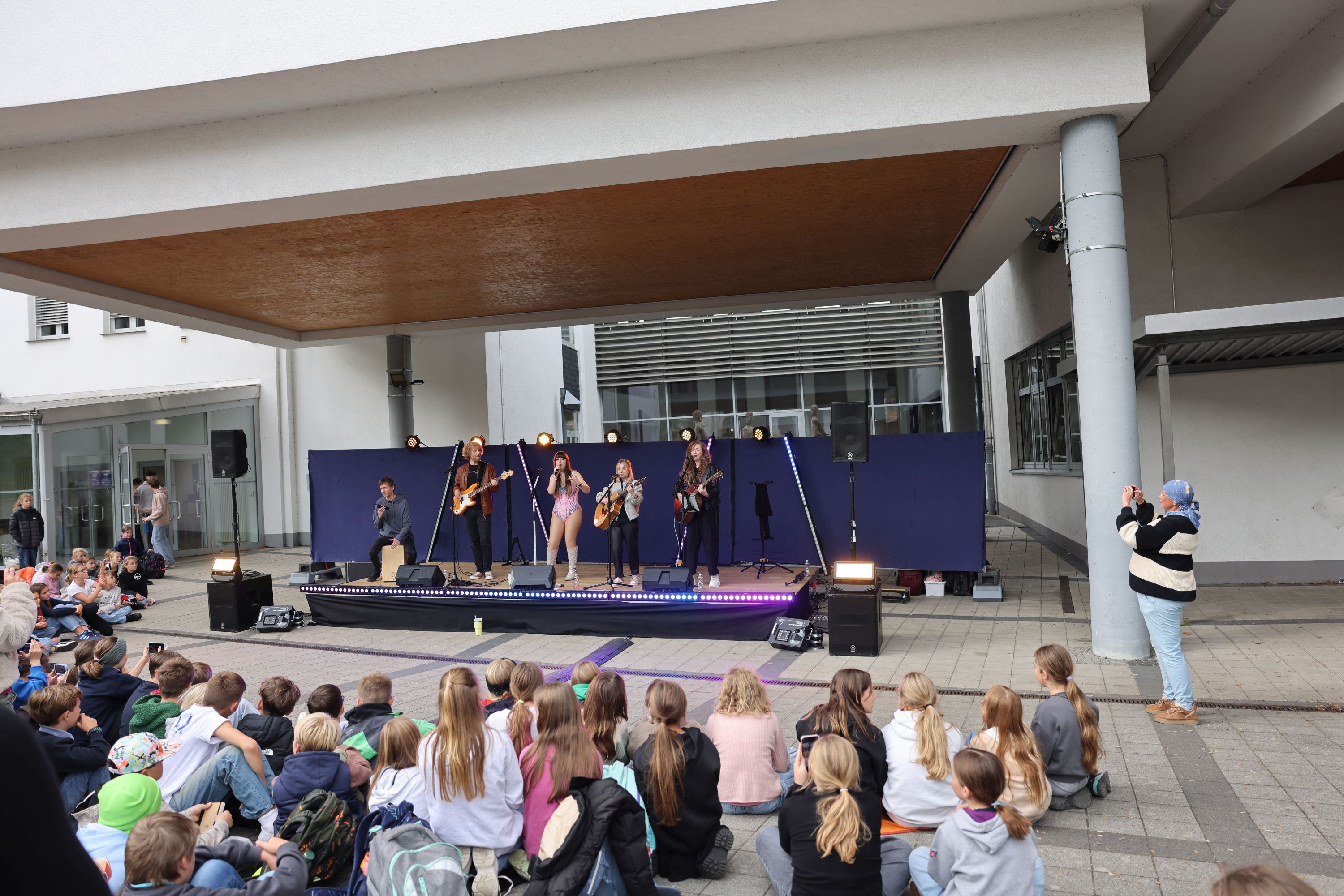 Am Freitag, den 26. September 2025, erlebten die Schülerinnen und Schüler der Jahrgänge 5 bis 8 ein besonderes Highlight: Für die jüngeren Jahrgänge stand an diesem Mittag nicht Mathe oder Deutsch auf dem Plan, sondern ein Live-Konzert, das eine willkommene Abwechslung vom Schulalltag bot. Die Coverband Love Story, die bekannte Songs von Taylor Swift interpretiert, trat am Mittag auf dem Schulhof des Mariengymnasiums auf. Mit Unterstützung der Technik-AG wurde der Pausenhof ab 12 Uhr in eine improvisierte Bühne mit passendem Ton und Licht verwandelt.