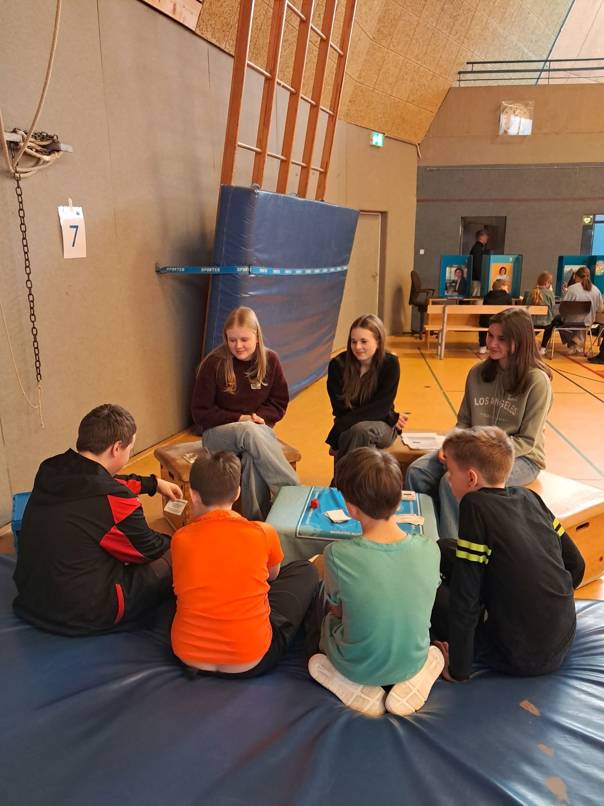 Am 10. Februar unterstützten mehrere Schülerinnen und Schüler der Einführungsphase den Jahrgang 6 der Sekundarschule am Eichholz bei der Durchführung des Body+Grips-Mobils des Deutschen Roten Kreuzes. Das Präventionsangebot bestand aus mehreren Stationen, an denen die Sechstklässler ihre Fitness testeten, sich mit gesunder Ernährung auseinandersetzten und sich über Sucht sowie deren Folgen informierten.