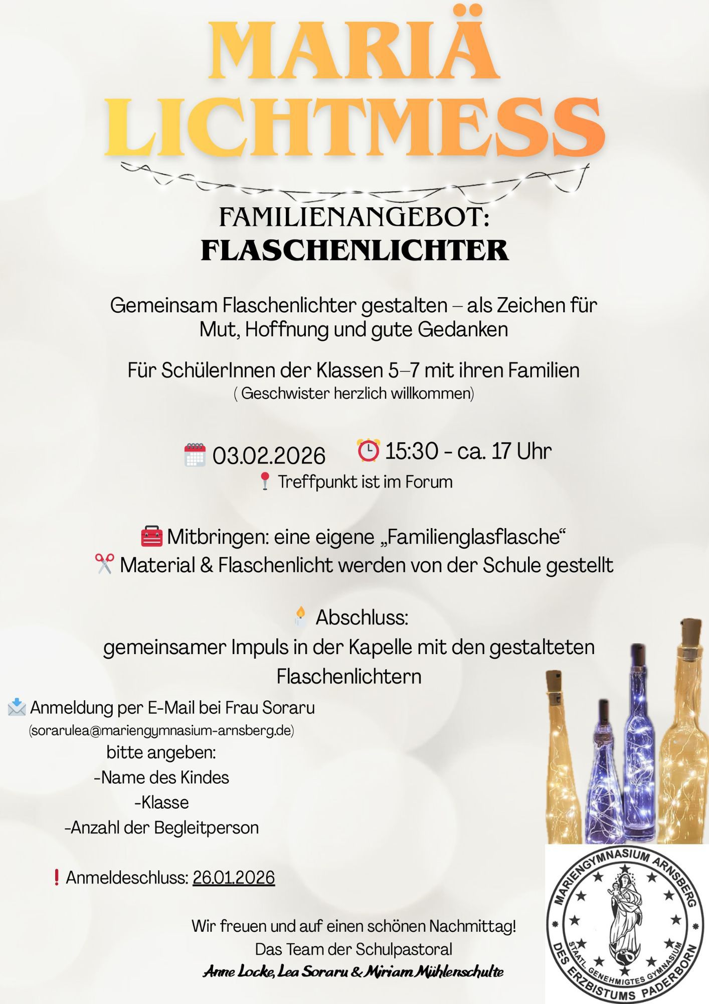 Gemeinsam mit ihren Familien gestalten Schülerinnen und Schüler der Klassen 5 bis 7 eigene Flaschenlichter. Sie stehen symbolisch für Mut, Hoffnung sowie gute Gedanken und Wünsche für das kommende Jahr. Geschwister sind willkommen.