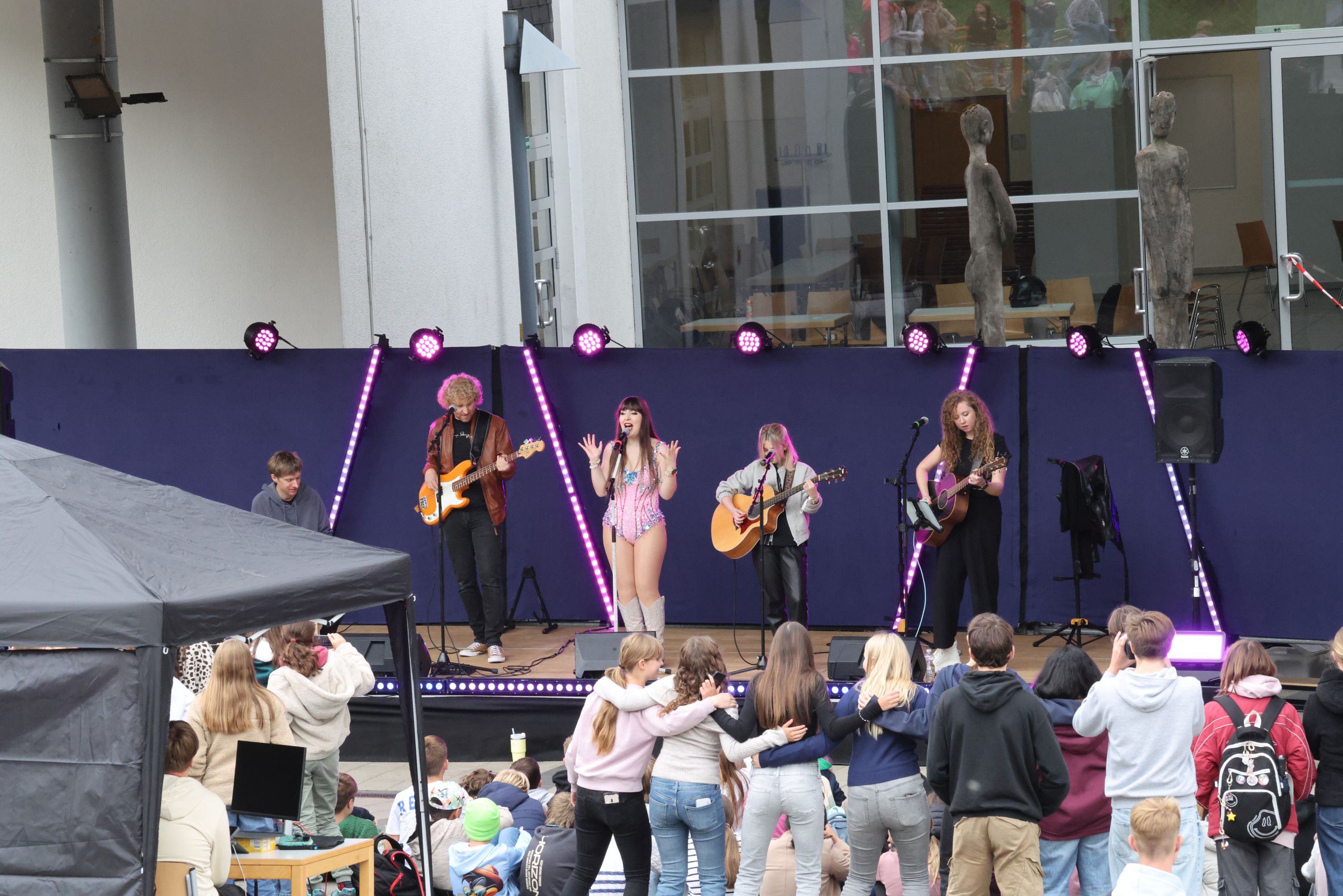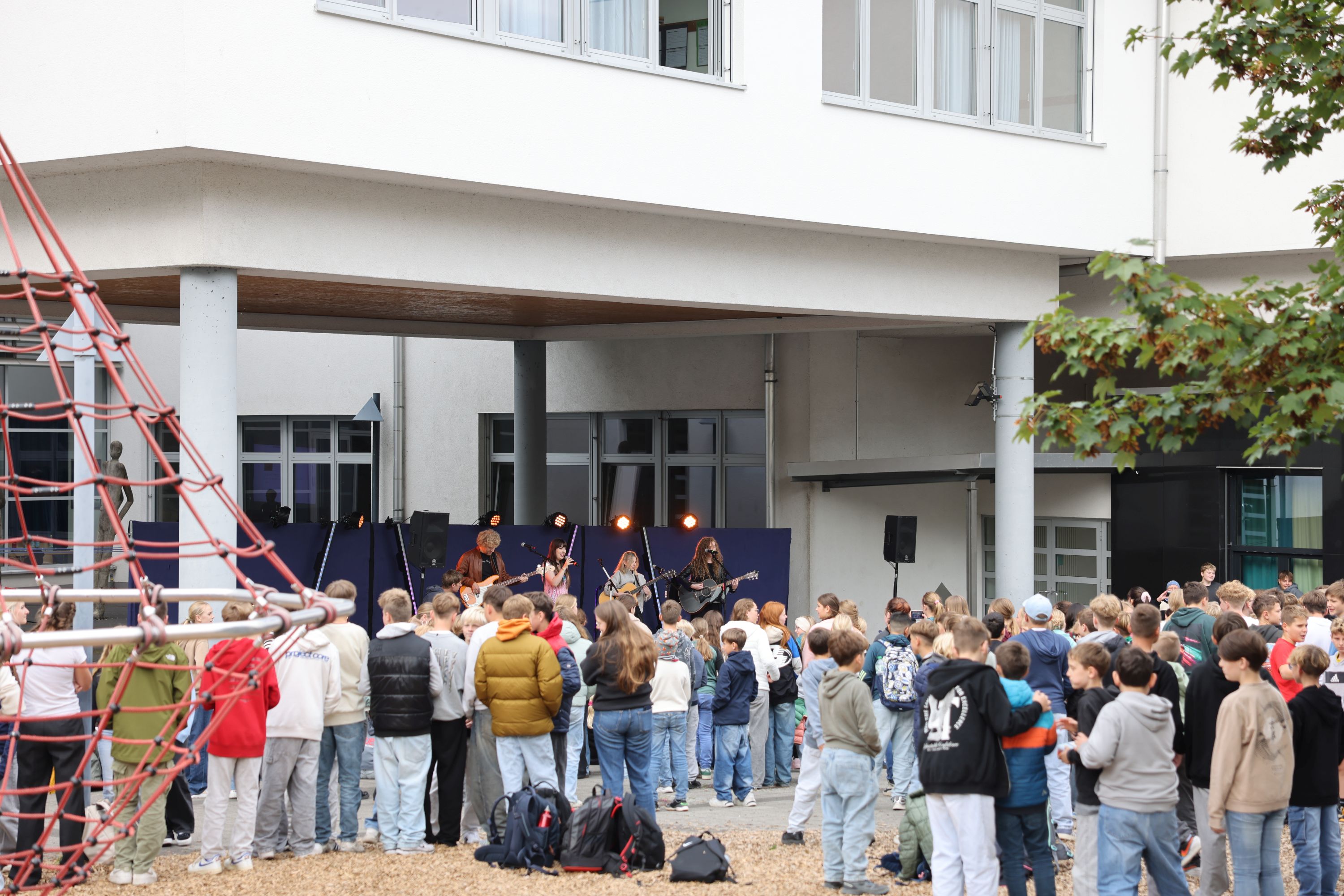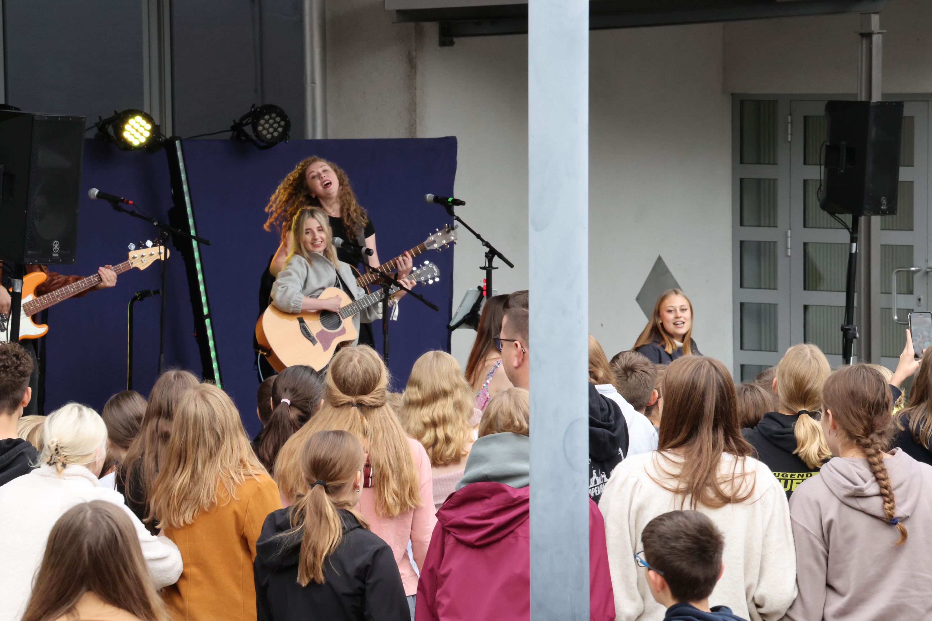 Die Songs luden sofort zum Mitsingen ein. Viele Schülerinnen und Schüler stimmten in die Refrains ein, wodurch ein gemeinschaftlicher Klang entstand, dem sich auch Lehrkräfte anschlossen. Das Konzert bleibt damit als fröhlicher und gemeinschaftsstiftender Moment im Gedächtnis.