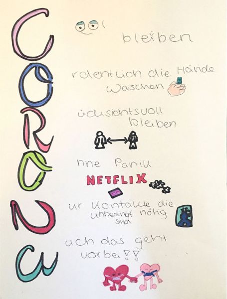 Die Corona-Krise stellt für alle Menschen weltweit eine Herausforderung dar. Viele Menschen sorgen sich und müssen mit Beeinträchtigungen zurechtkommen. Auch für unsere Schulgemeinschaft stellen die aktuellen Begebenheiten eine aufregende uns sicher keine leicht Zeit dar. Um uns gegenseitig Mut zu machen und den Blick auf positive Dinge zu wenden, ist die Idee entstanden, dass Schüler, Eltern, Sekretärinnen, Hausmeister und Lehrer kleine „Mutmacher“ kreativ gestalten. Diese sollen in regelmäßigen Abständen auf der Homepage veröffentlicht werden. Allen Beteiligten danken wir herzlich für ihren Einsatz.
