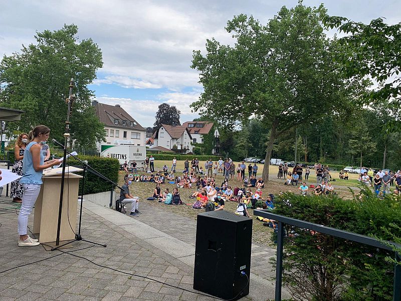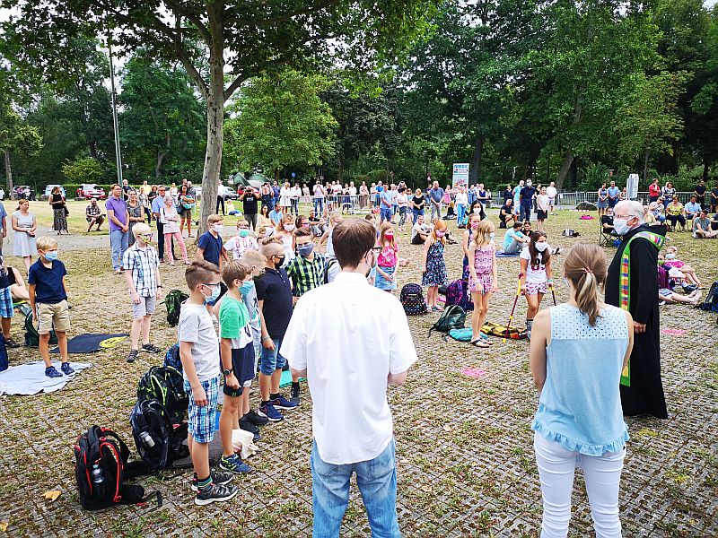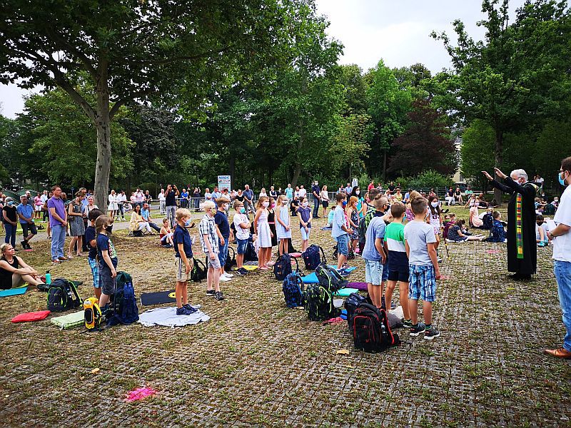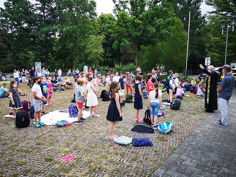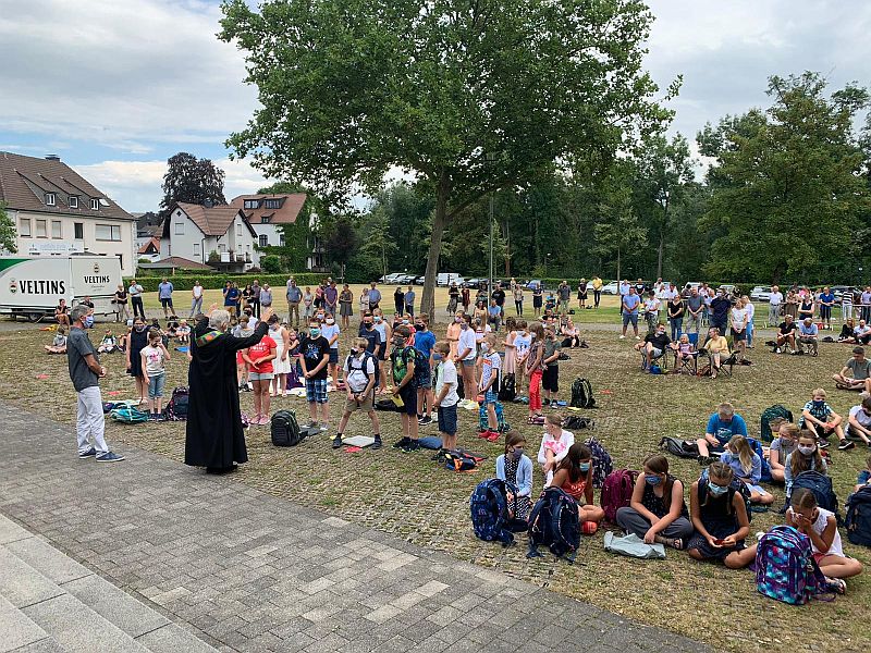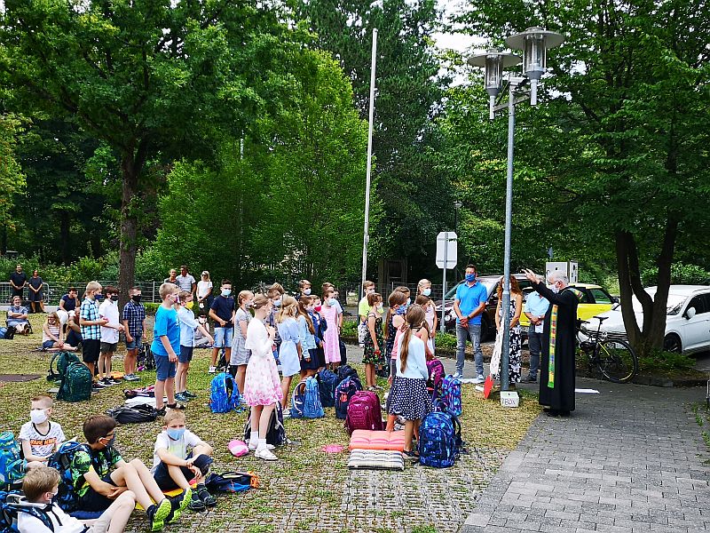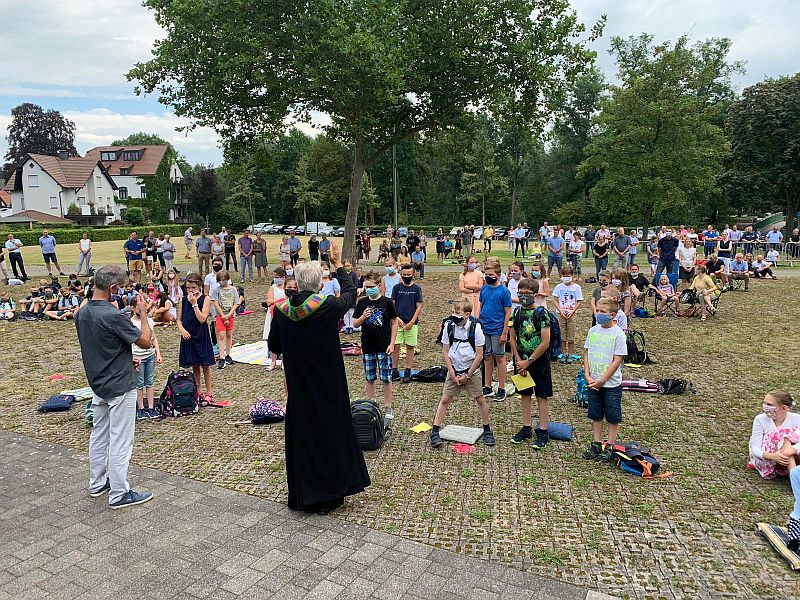 Im Rahmen eines festlichen ökumenischen Gottesdienstes wurden die neuen Schülerinnen und Schüler unter freiem Himmel vor der Schützenhalle willkommen geheißen.