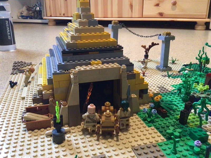 Die Pyramide ist 18 Legosteine hoch und der Durchmesser der Pyramidengrundfläche besteht aus 56 Steinen. Ich hatte leider nicht genug Sandsteine. Deswegen habe ich auch graue und gelbe Steine benutzt. Ich habe mir viel Mühe gegeben.