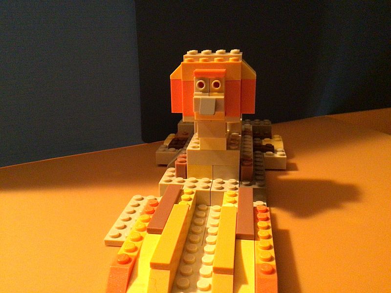 Meine aus Legosteinen erbaute Sphinx ist 21,5 cm lang, 8,5 cm hoch und 9,5 cm breit. Um die wichtigsten Bestandteile hervorzuheben, habe ich den Kopf und die ausgestreckten Beine mit gelben und orangen Bausteinen gestaltet. Die Nase und ein Teil des Rückens sind abnehmbar, sodass die ursprüngliche Gestaltung und der heutige Zustand dargestellt werden kann.