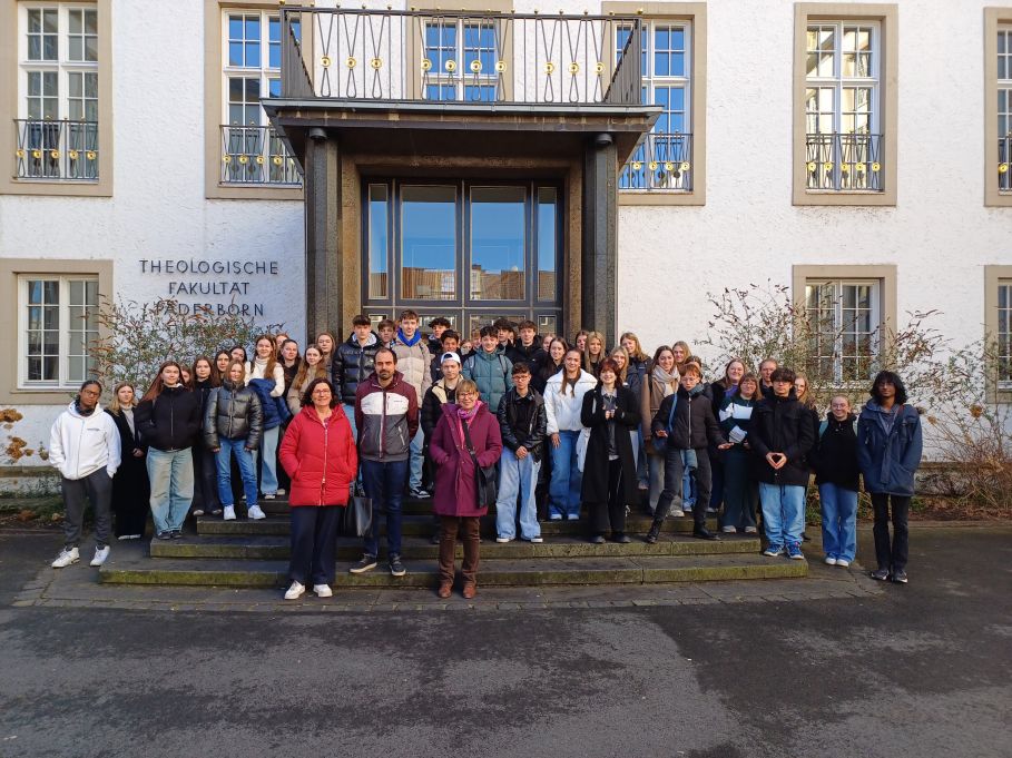 Am 17. März 2025 unternahmen wir, die gesamte Stufe EF, eine Exkursion nach Paderborn, um im Rahmen der SchulUni.Theologie zwei Vorlesungen an der Theologischen Fakultät zu besuchen und den Paderborner Dom im Rahmen einer Führung zu besichtigen. Frau Müer, Frau Springer und Herr Ante, die in unserer Stufe das Unterrichtsfach katholische Religionslehre unterrichten, begleiteten uns.