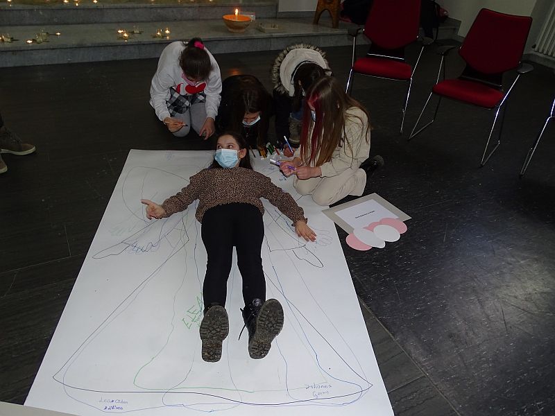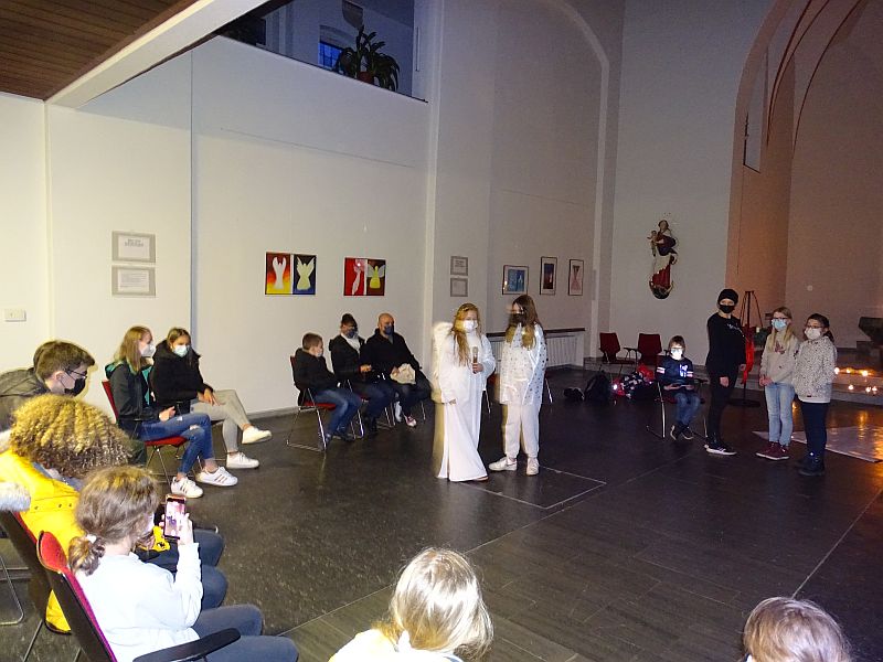 Im Kunstraum konnten die Gäste kreativ arbeiten, während sie in der Kapelle die Kunstwerke von Schülerinnen und Schülern sehen konnten, die deren Vorstellungen von Engeln zeigten. Passend dazu führten Schülerinnen und Schüler der Jahrgangsstufe 5 ein Schauspiel über Engel auf.